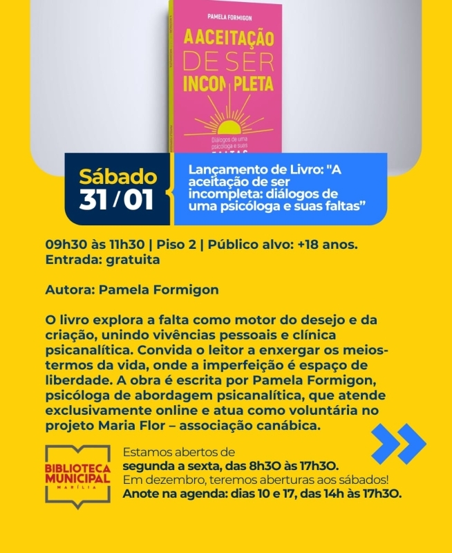 BMM LANÇAMENTO DO LIVRO: A aceitação de ser incompleta: diálogos de uma psicóloga e suas faltas